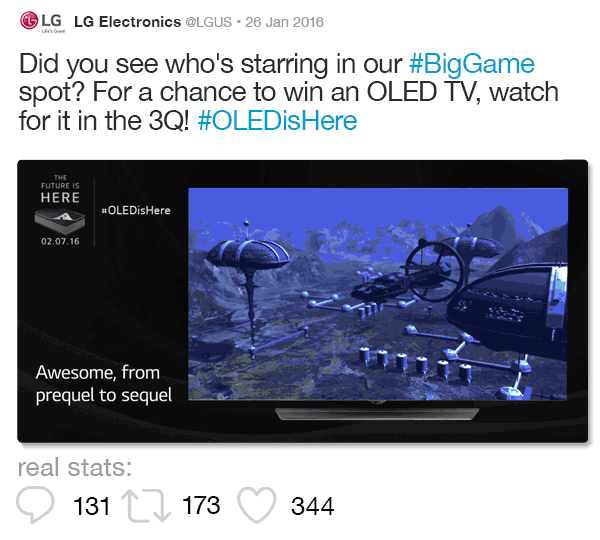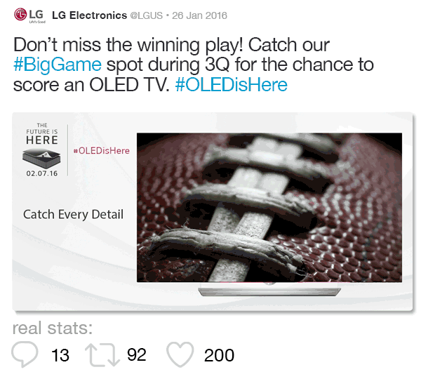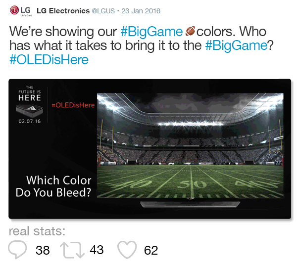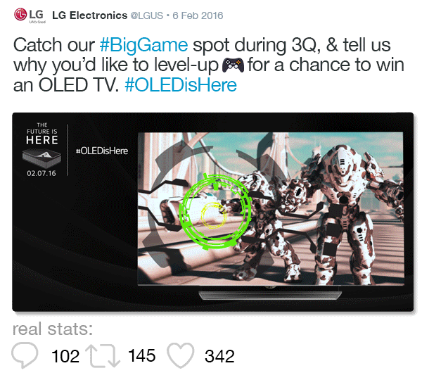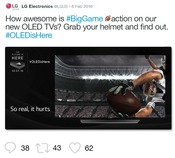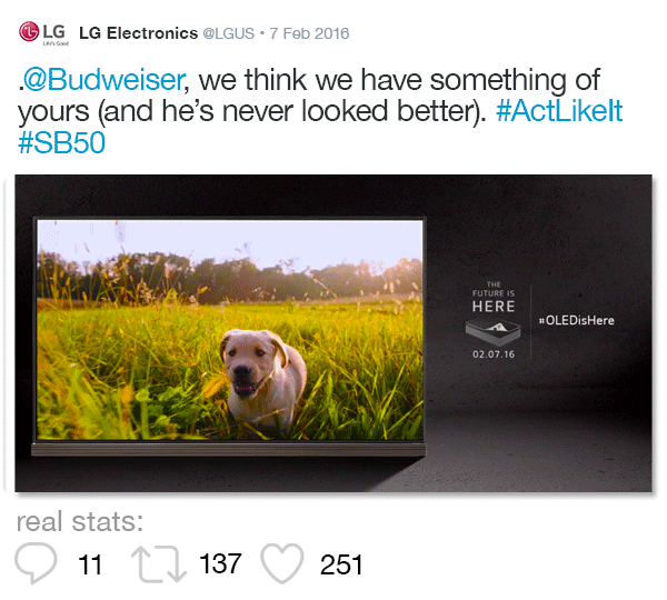 I wrote and animated hundreds of these over the weeks leading up to – and during – the Superbowl. As a result, LG became the #1 most-talked-about Super Bowl advertiser and the #4 brand in overall Super Bowl social mentions.